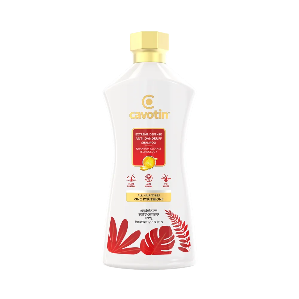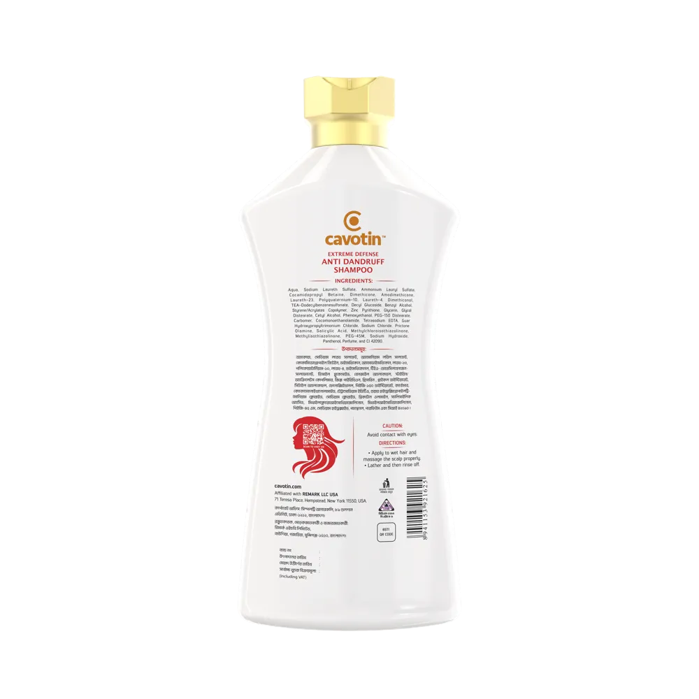 Cavotin Extreme Defense Anti-Dandruff Shampoo is a specially crafted formula designed to efficiently eliminate flakes and soothe scalp irritation. Its blend of ingredients ensures thorough cleansing, nourishes the scalp, inhibits the development of dandruff-causing fungi, and eliminates dead skin cells.