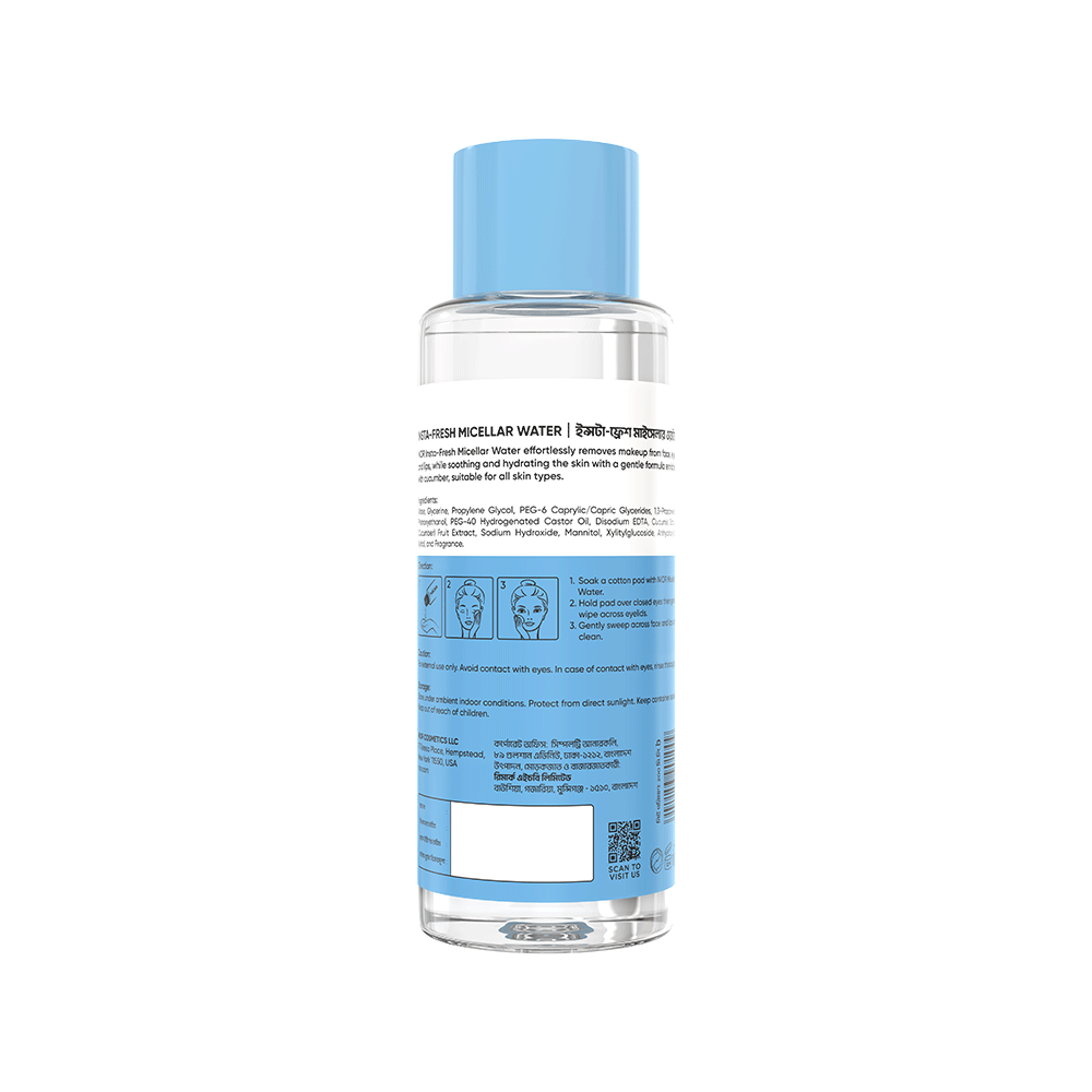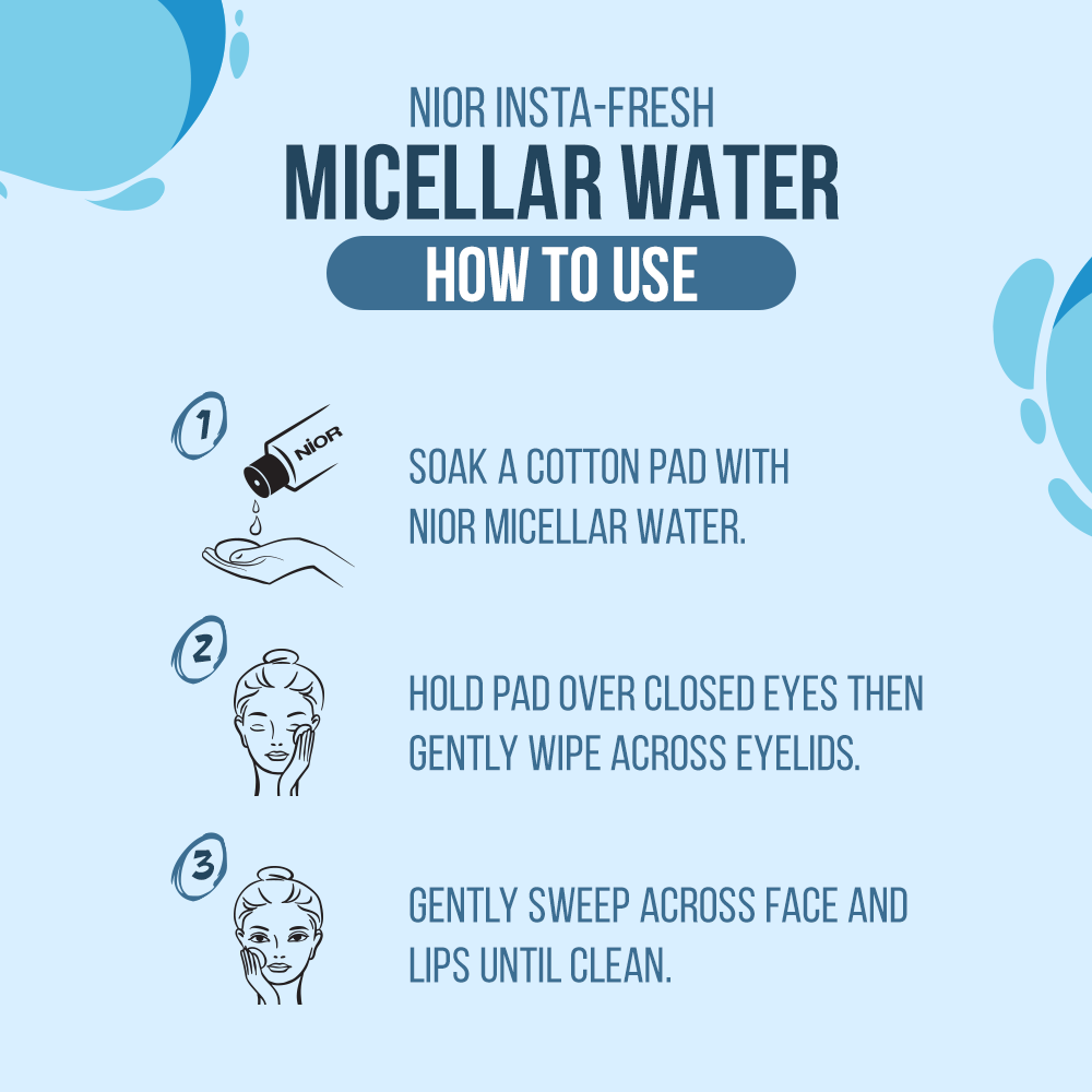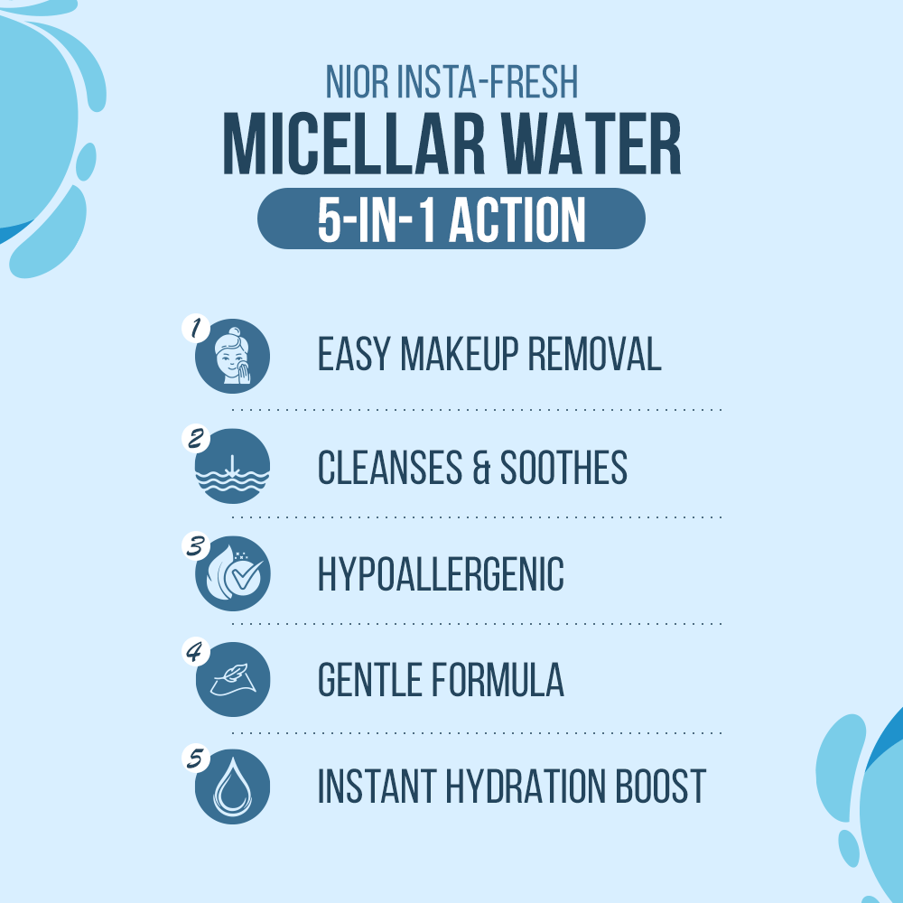 NIOR Insta-Fresh Micellar Water effortlessly removes makeup from face, eyes, and lips, while soothing and hydrating the skin with a gentle formula enriched with cucumber, suitable for all skin types.