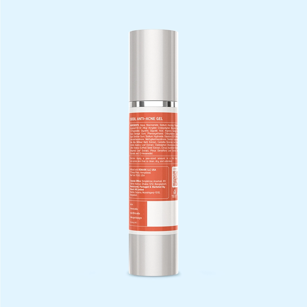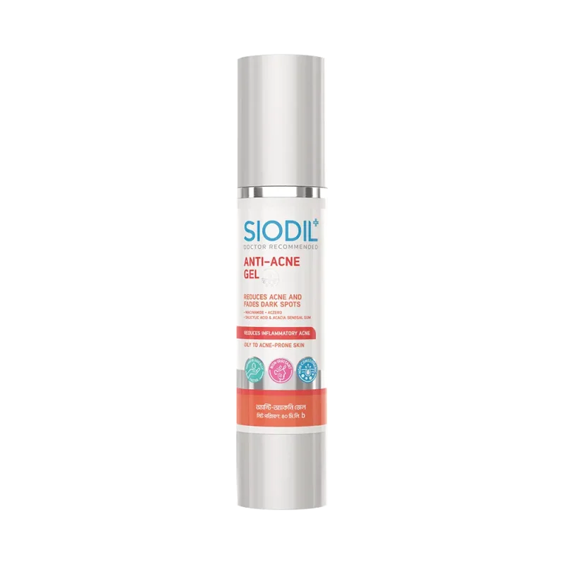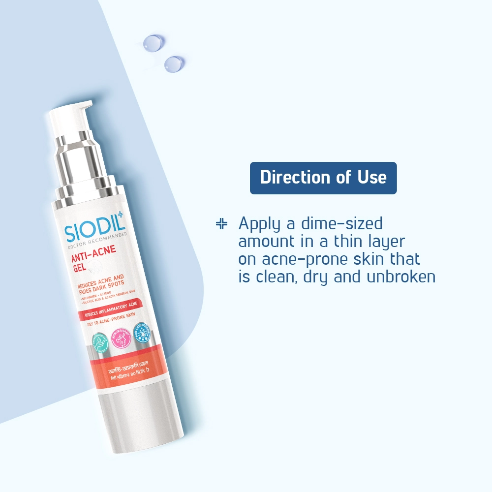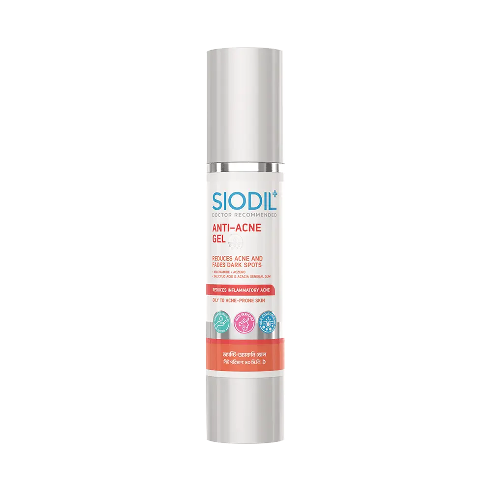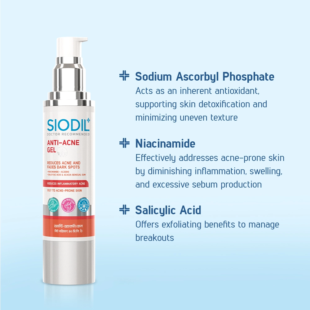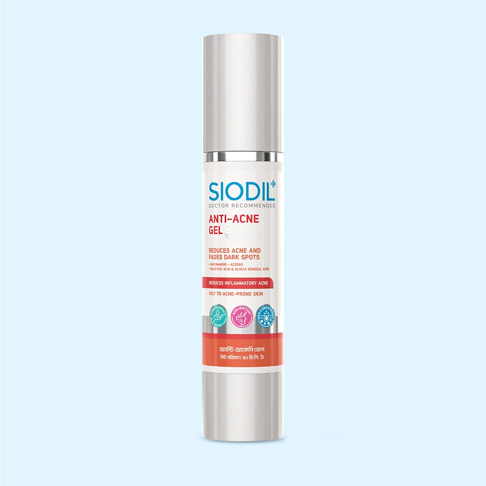 Siodil Anti-Acne Gel is an advanced formulation infused with a high concentration of active ingredients such as Niacinamide. Sodium Ascorbyl Phosphate and Salicylic Acid & Acacia Senegal Gum that reduce acne and fade dark spots.