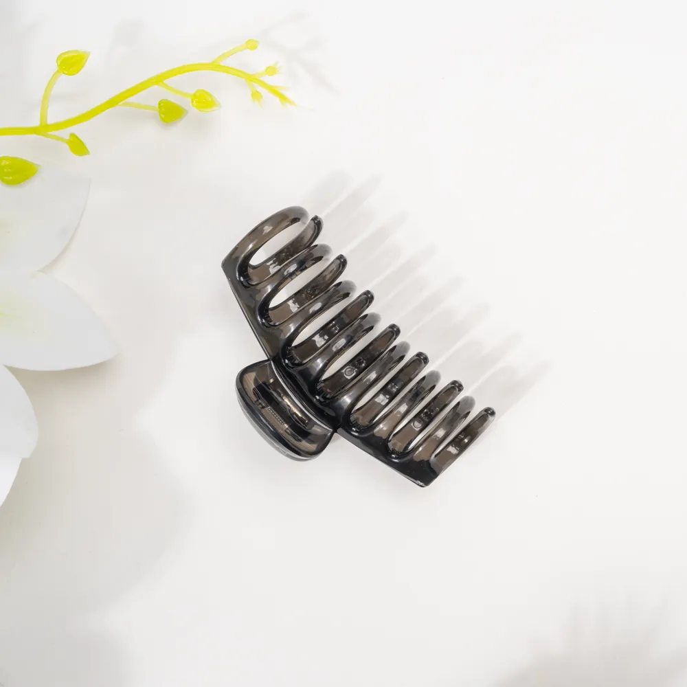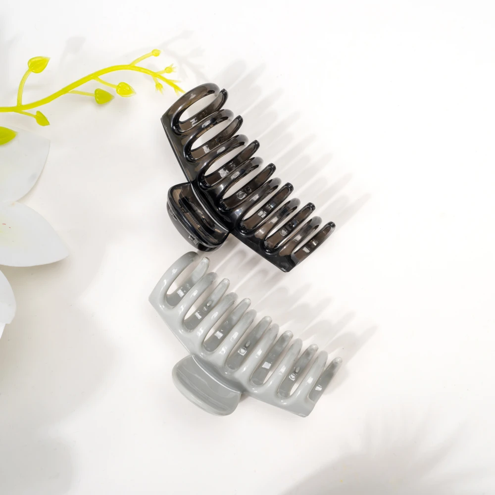 Accessorize your perfect hairstyle with the classic Barrel Jaw Clip. Its sleek design and strong grip make it the perfect choice for both everyday wear and special occasions. Whether you’re styling a bun or a ponytail, this clip ensures a flawless finish. This two piece combo features 8.5 cm barrel jaw clips in the colors Gray and Transparent Black.