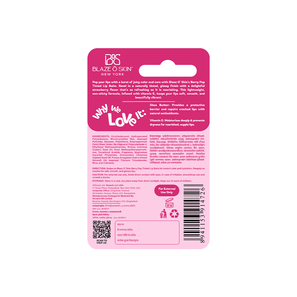 Pop your lips with a burst of juicy color and care with Blaze O’ Skin’s Berry Pop Tinted Lip Balm. Revel in a naturally tinted, glossy finish with a delightful berry flavor that’s as refreshing as it is nourishing. This lightweight, non-sticky formula, infused with Vitamins E, keeps your lips soft, smooth, and beautifully vibrant.
