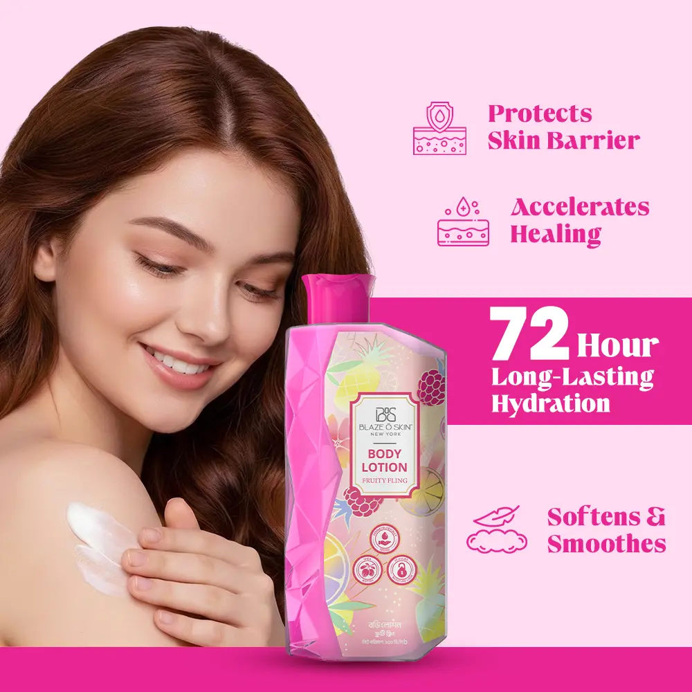 Indulge in the heavenly embrace of Blaze O’ Skin’s Fruity Fling Body Lotion! Let the vibrant essence of fruity florals intertwine with a fountain of moisture, creating a symphony for your skin that lasts an incredible 72 hours. It bonds gracefully to safeguard the integrity of the skin barrier and speed up the process of healing superficial wounds and irritations.