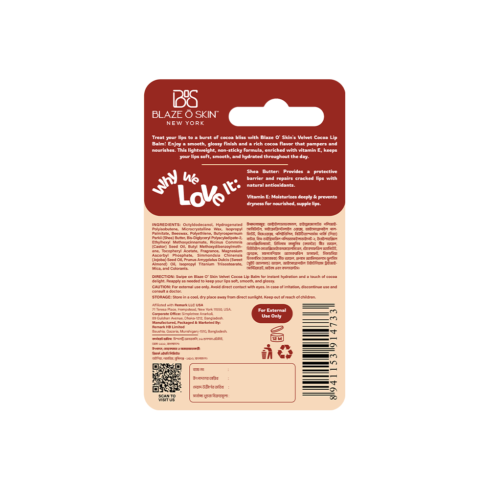 | Treat your lips to a burst of cocoa bliss with Blaze O’ Skin’s Velvet Cocoa Lip Balm! Enjoy a smooth, glossy finish and a rich cocoa flavor that pampers and nourishes. This lightweight, non-sticky formula, enriched with vitamin E, keeps your lips soft, smooth, and hydrated throughout the day. |