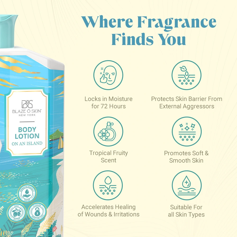 Indulge in the heavenly embrace of Blaze O’ Skin’s “On an Island” Body Lotion! Let the refreshing scent of the sea intertwine with a fountain of moisture, creating a symphony for your skin that lasts an incredible 72 hours. It bonds gracefully to safeguard the integrity of the skin barrier and speed up the process of healing superficial wounds and irritations.