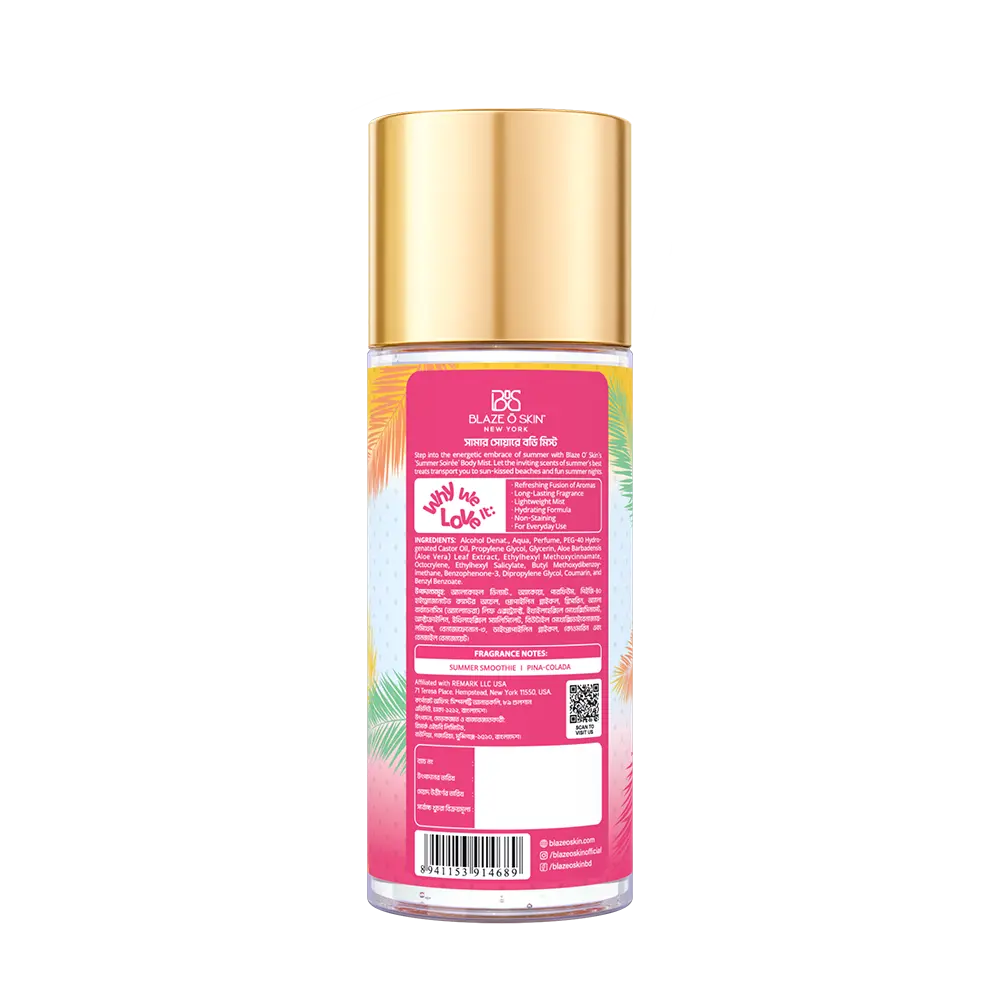 | Step into the energetic embrace of summer with Blaze O’ Skin’s ‘Summer Soirée’ Body Mist. This vibrant fragrance combines the refreshing scent of luscious tropical fruits with the creamy allure of pina colada, capturing the essence of sun-soaked beaches and lively summer days. Each spritz transports you to a world of sunny escapades and festive fun, making every moment feel like a perfect summer celebration. |