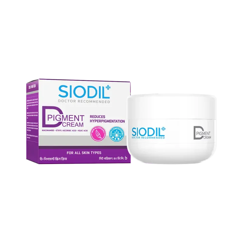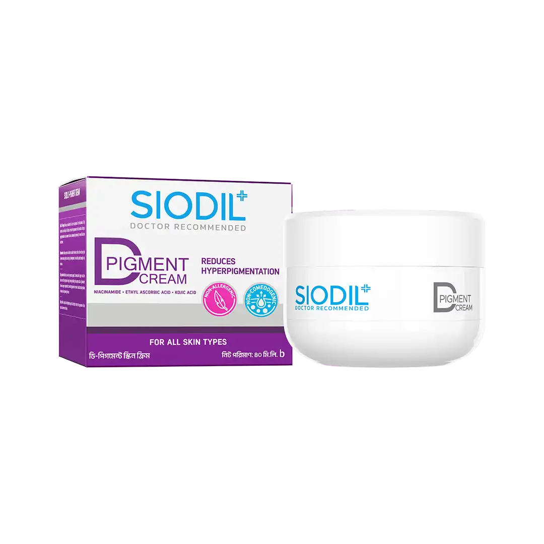 Siodil D-Pigment Cream, formulated with active ingredients like Niacinamide, Ethyl Ascorbic Acid and Kojic Acid helps to reduce the appearance of dark patches and spots, hyperpigmentation, and uneven skin tone, subsequently improving the overall skin tone and texture.