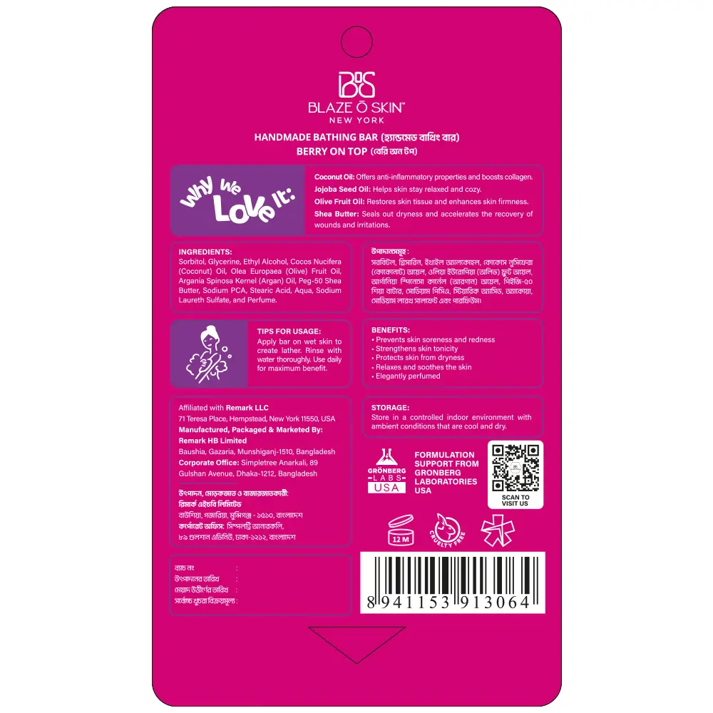 Savor your shower with this handmade bathing bar, meticulously made with shea butter and natural oils to pamper your skin with deep hydration and abundant nourishment, leaving a delightful aroma of freshly picked berries.