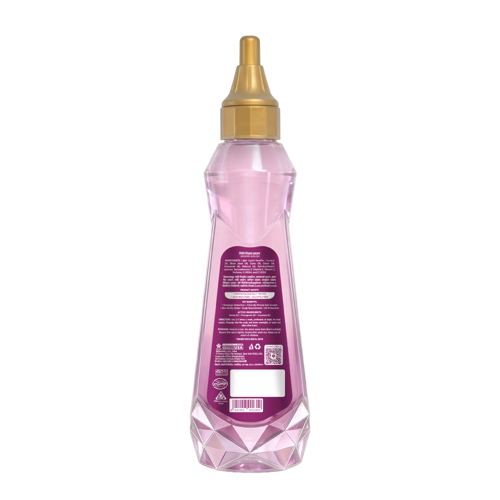 Light liquid Paraffin, Coconut oil, Black seed oil, Curry Oil, Onion Oil, Fenugreek oil, Hibiscus oil, Tert-butylhydroquinone, Benzophenone-3, Vitamin E, Vitamin C, Perfume, CI 61554 & CI 12355.Directions