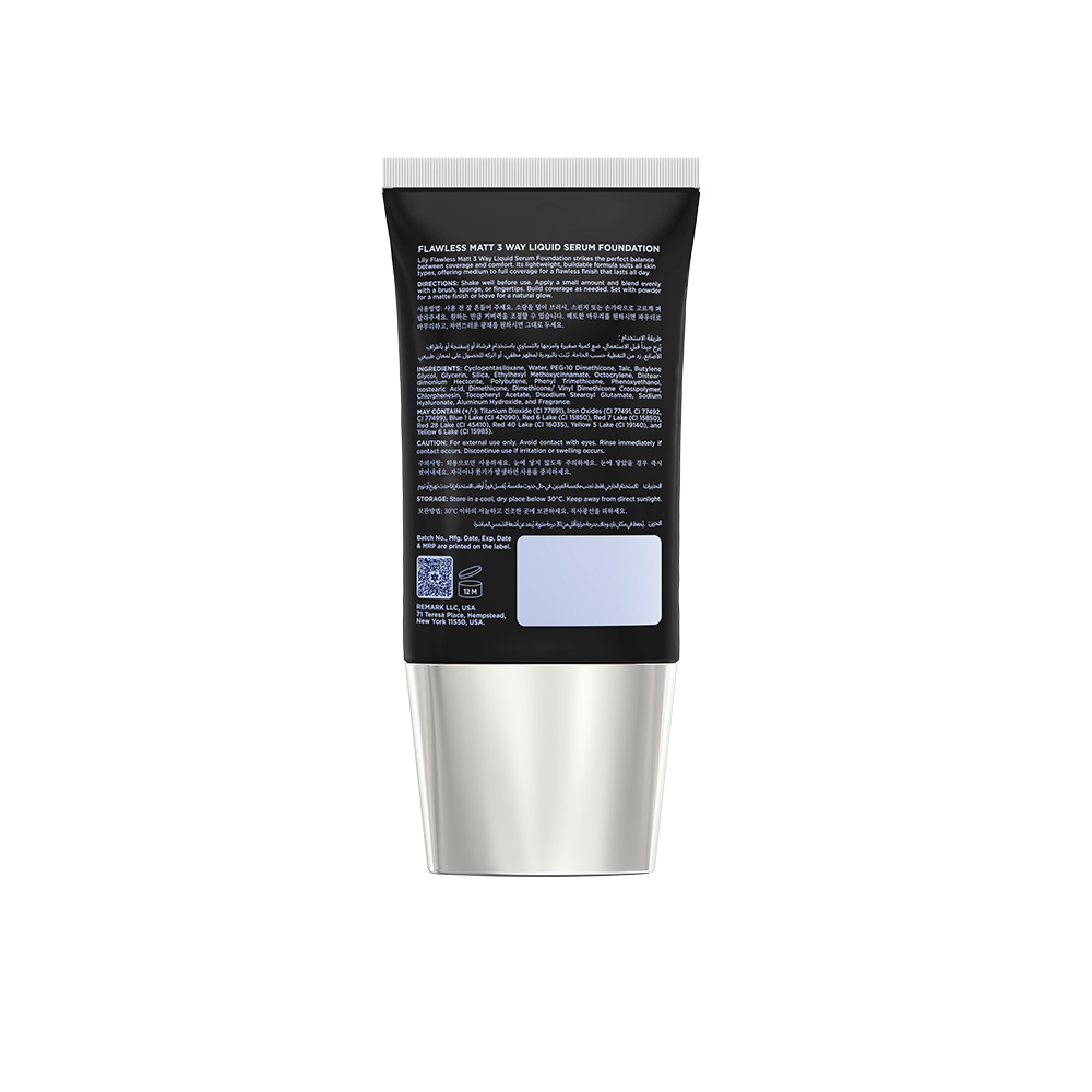Lily Flawless Matt 3 Way Liquid Serum Foundation strikes the perfect balance between coverage and comfort. Its lightweight, buildable formula suits all skin types, offering medium to full coverage for a flawless finish that lasts all day.