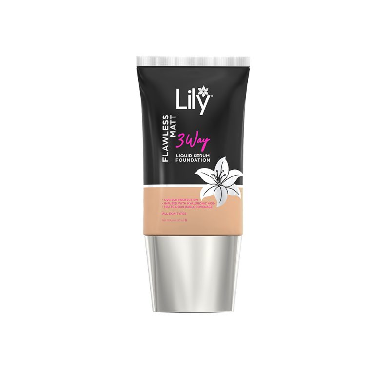 Lily Flawless Matt 3Way Liquid Serum Foundation provides UVB sun protection, is infused with Hyaluronic Acid for lasting hydration, and delivers matte, buildable coverage for a smooth, natural-to-flawless finish without heaviness. Perfect for everyday comfortable wear.
