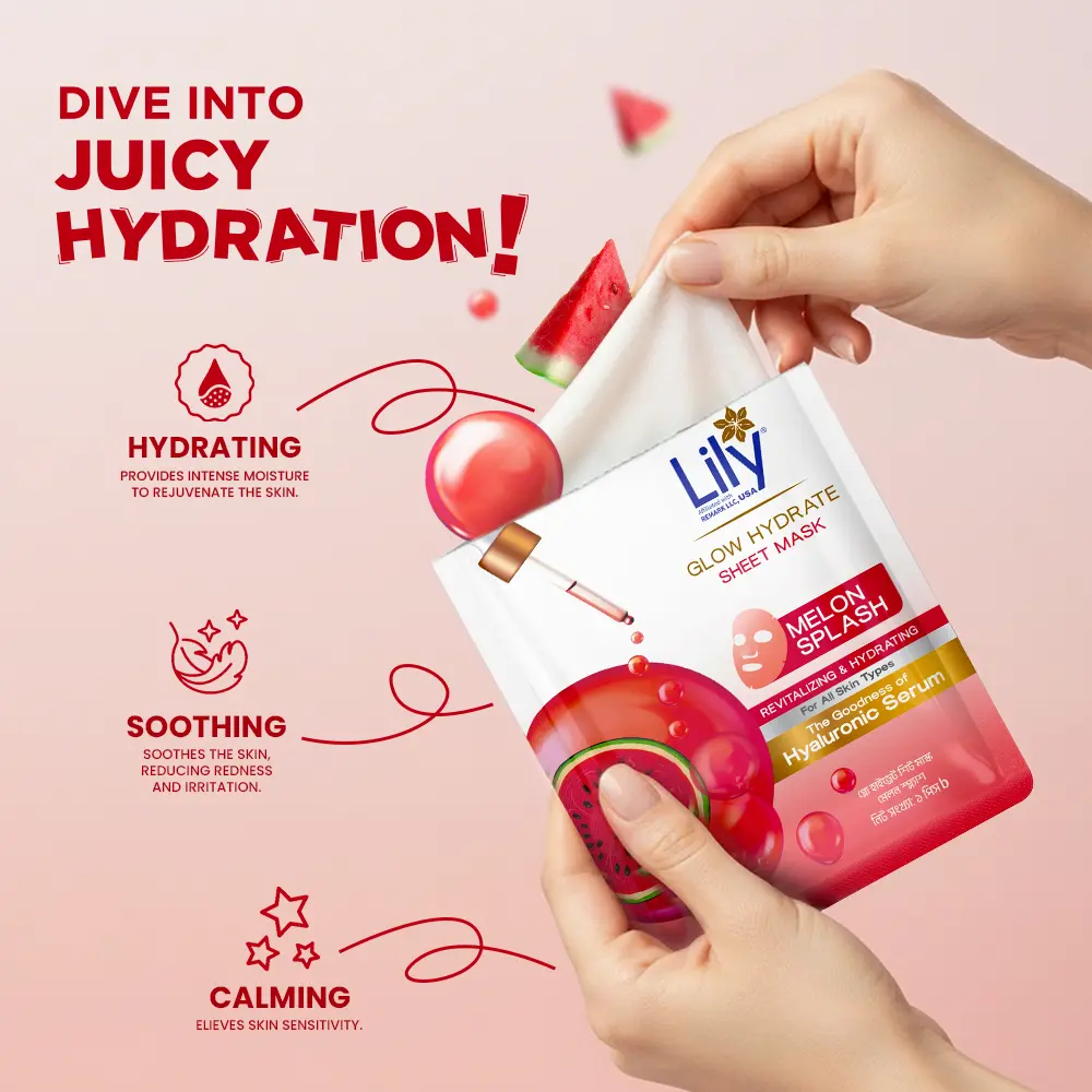 | Lily Glow Hydrate Sheet Mask (Melon Splash) is your ultimate hydration solution. Infused with Hyaluronic Acid serum, this mask offers nourishing benefits in just 15 minutes – deep hydration and soothing skin. |