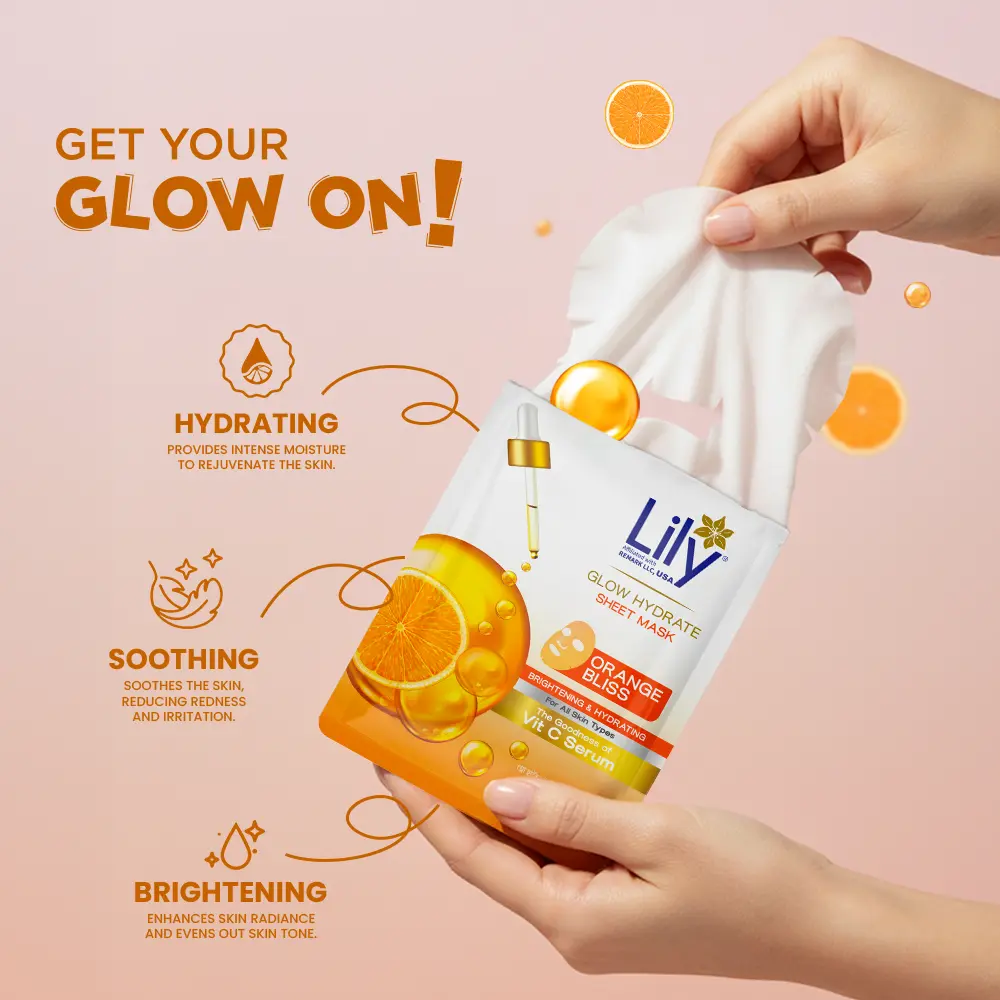 Lily Glow Hydrate Sheet Mask (Orange Bliss) uncovers your natural radiance with every use. Infused with Vitamin C serum, this mask offers nourishing benefits in just 15 minutes—brightening, deep hydration, and soothing skin.