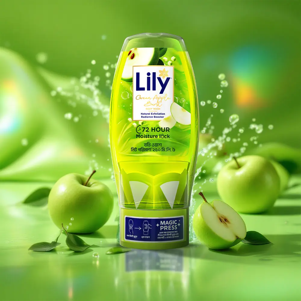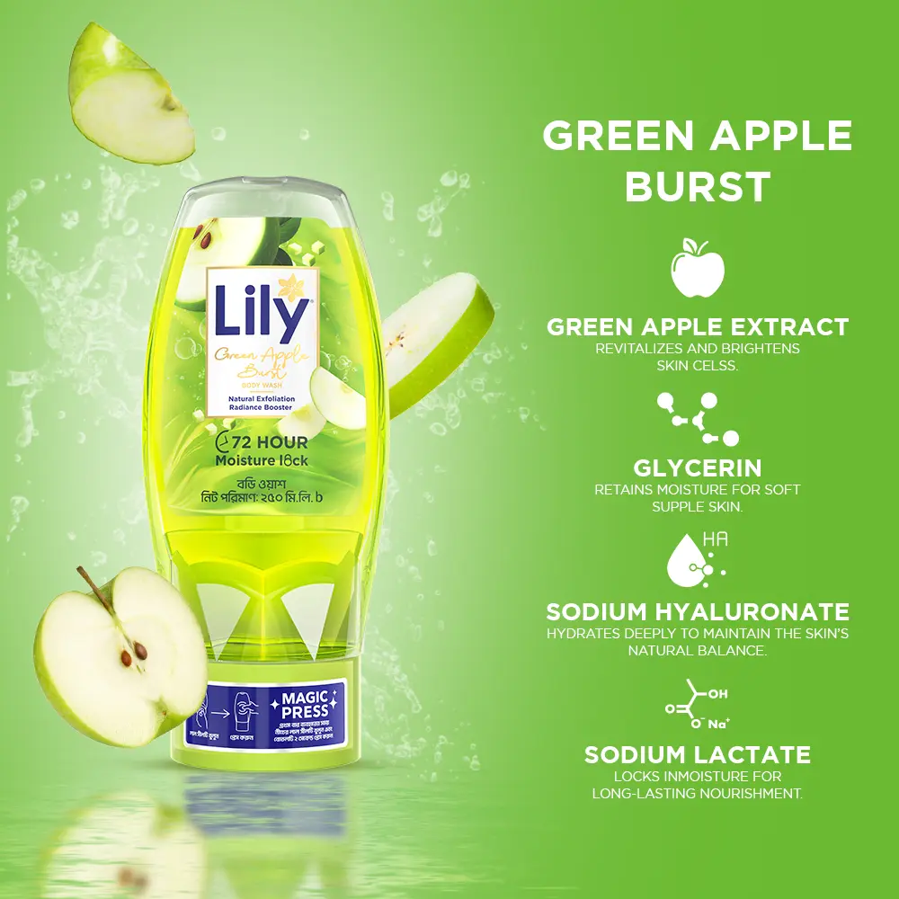 Lily Green Apple Liquid Gel Wash provides your skin with nourishment in every wash. Infused with the goodness of green apples, it illuminates and revitalizes skin cells, delivering a long-lasting moisture lock effect.