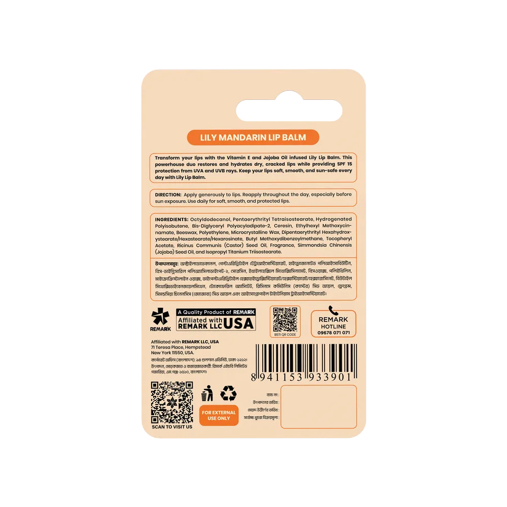 Transform your lips with Vitamin E and Jojoba Oil infused Lily Lip Balm. This powerhouse duo restores and hydrates dry, cracked lips while providing SPF 15 protection from UVA and UVB rays. Keep your lips soft, smooth, and sun-safe every day with Lily Lip Balm.