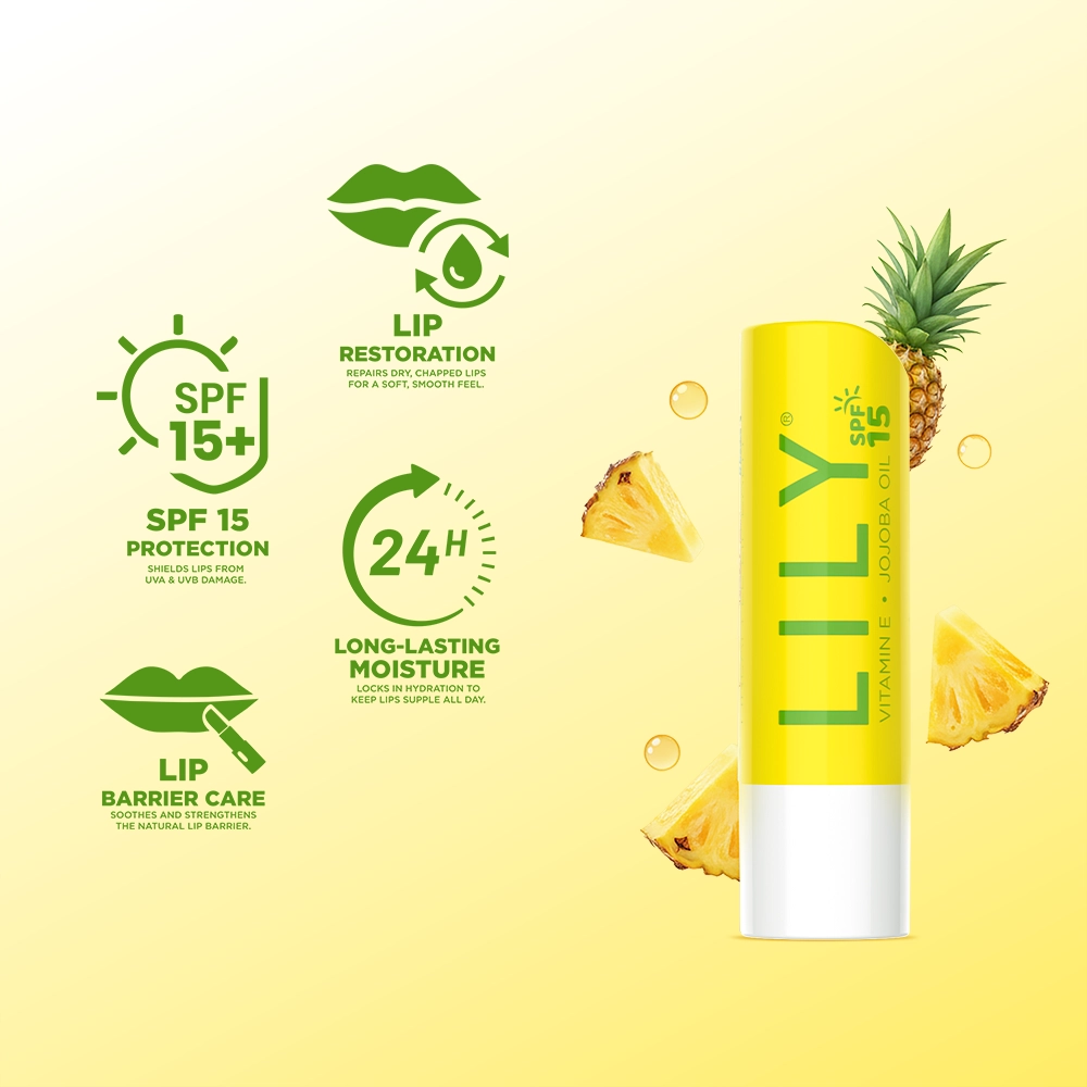 Transform your lips with Vitamin E and Jojoba Oil infused Lily Lip Balm. This powerhouse duo restores and hydrates dry, cracked lips while providing SPF 15 protection from UVA and UVB rays. Keep your lips soft, smooth, and sun-safe every day with Lily Lip Balm.