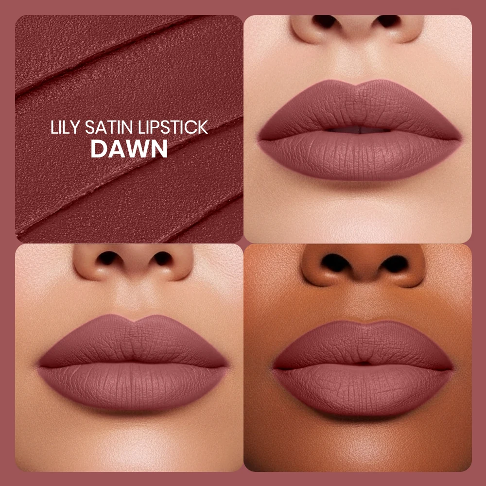 Lily Satin Lipstick empowers your pout with vibrant color, long-lasting wear, and nourishing moisture. This lipstick features a buildable, smudge-proof formula for a natural finish that elevates your confidence. Feel assured and let your lips exude grace with a burst of nurturing moisture that lasts all day!