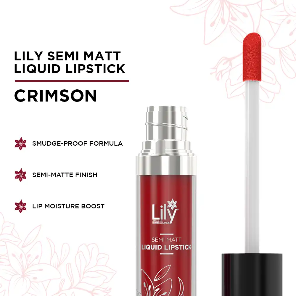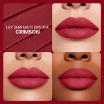 Vitamin E: In addition to adorning your lips with distinctive shades, Lily Semi Matt Lipstick nurtures and hydrates your lips, ensuring they maintain their graceful charm. Jojoba Oil: Guarantees your lips remain velvety smooth and poised from sunrise to sunset. Rosa Canina Oil: Gently soothes and heals chapped lips. Other Ingredients : Isododecane, Disteardimonium Hectorite, Octyldodecanol, Nylon-12, Silica, Hydrogenated Styrene/Butadiene Copolymer, Polymethylsilsesquioxane, Hydrogenated Polyisobutene, Diethylhexyl Syringyliden, Tocopheryl Acetate, Rosa Canina Oil, Jojoba Oil, Olea Europaea Oil, Butyrospermum Parkii Oil and FragranceDescription