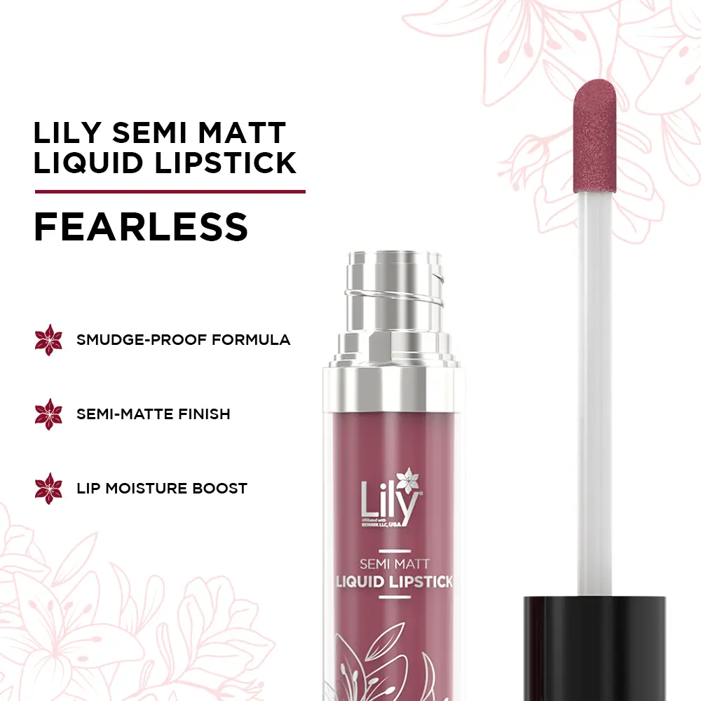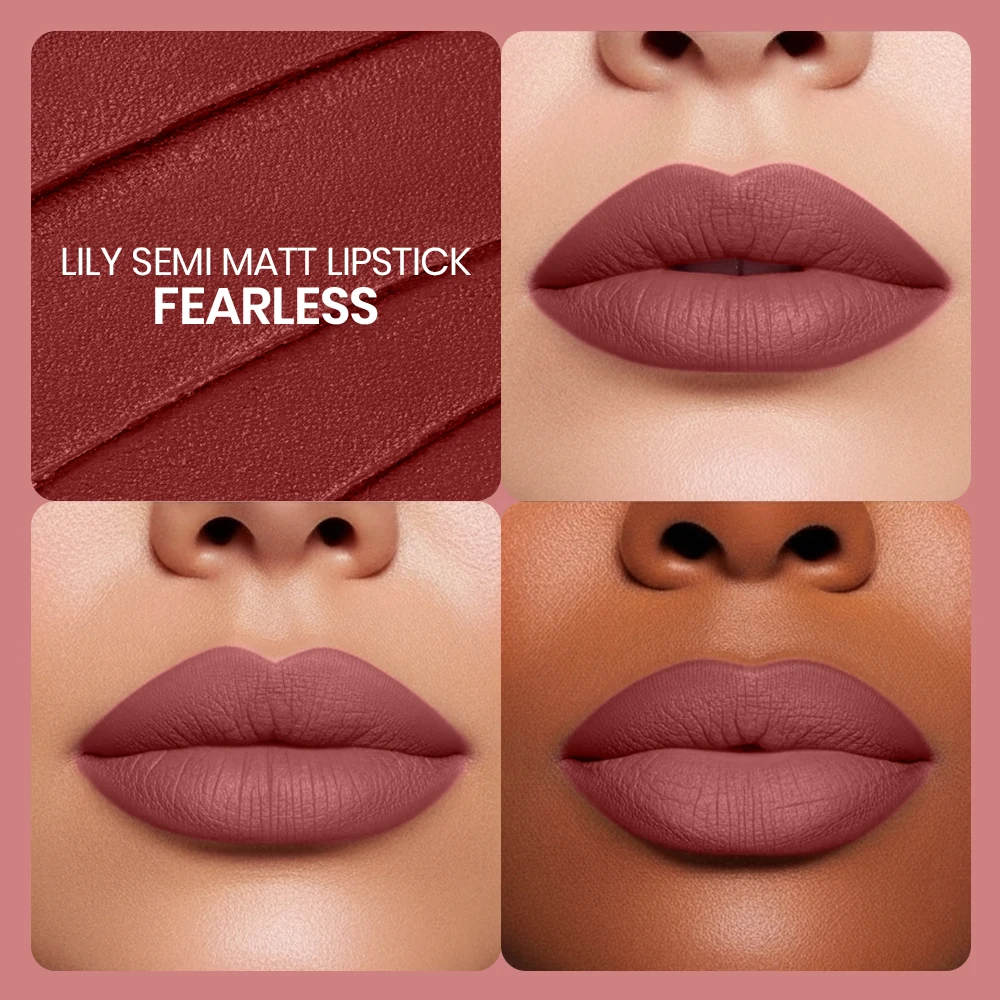 Vitamin E: In addition to adorning your lips with distinctive shades, Lily Semi Matt Lipstick nurtures and hydrates your lips, ensuring they maintain their graceful charm. Jojoba Oil: Guarantees your lips remain velvety smooth and poised from sunrise to sunset. Rosa Canina Oil: Gently soothes and heals chapped lips. Other Ingredients : Isododecane, Disteardimonium Hectorite, Octyldodecanol, Nylon-12, Silica, Hydrogenated Styrene/Butadiene Copolymer, Polymethylsilsesquioxane, Hydrogenated Polyisobutene, Diethylhexyl Syringyliden, Tocopheryl Acetate, Rosa Canina Oil, Jojoba Oil, Olea Europaea Oil, Butyrospermum Parkii Oil and FragranceDescription