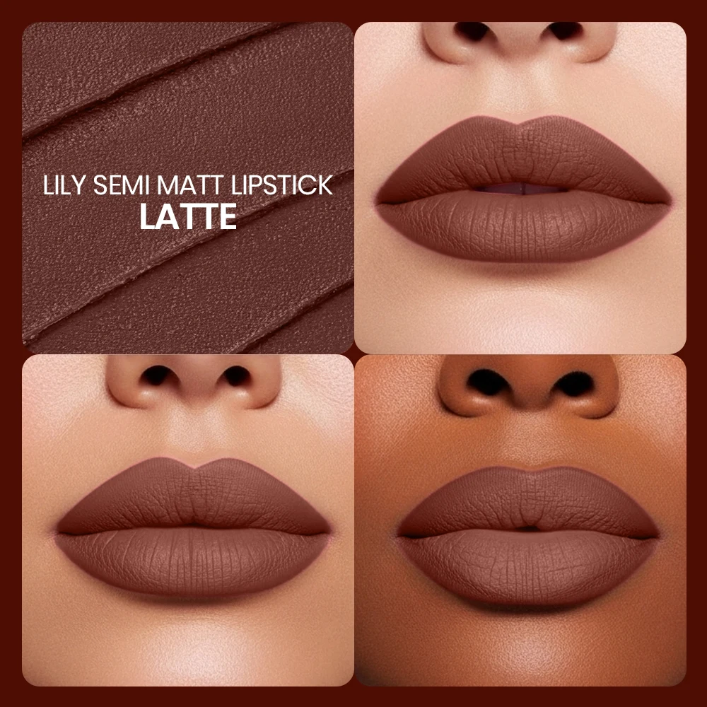 Vitamin E: In addition to adorning your lips with distinctive shades, Lily Semi Matt Lipstick nurtures and hydrates your lips, ensuring they maintain their graceful charm. Jojoba Oil: Guarantees your lips remain velvety smooth and poised from sunrise to sunset. Rosa Canina Oil: Gently soothes and heals chapped lips. Other Ingredients : Isododecane, Disteardimonium Hectorite, Octyldodecanol, Nylon-12, Silica, Hydrogenated Styrene/Butadiene Copolymer, Polymethylsilsesquioxane, Hydrogenated Polyisobutene, Diethylhexyl Syringyliden, Tocopheryl Acetate, Rosa Canina Oil, Jojoba Oil, Olea Europaea Oil, Butyrospermum Parkii Oil and FragranceDescription