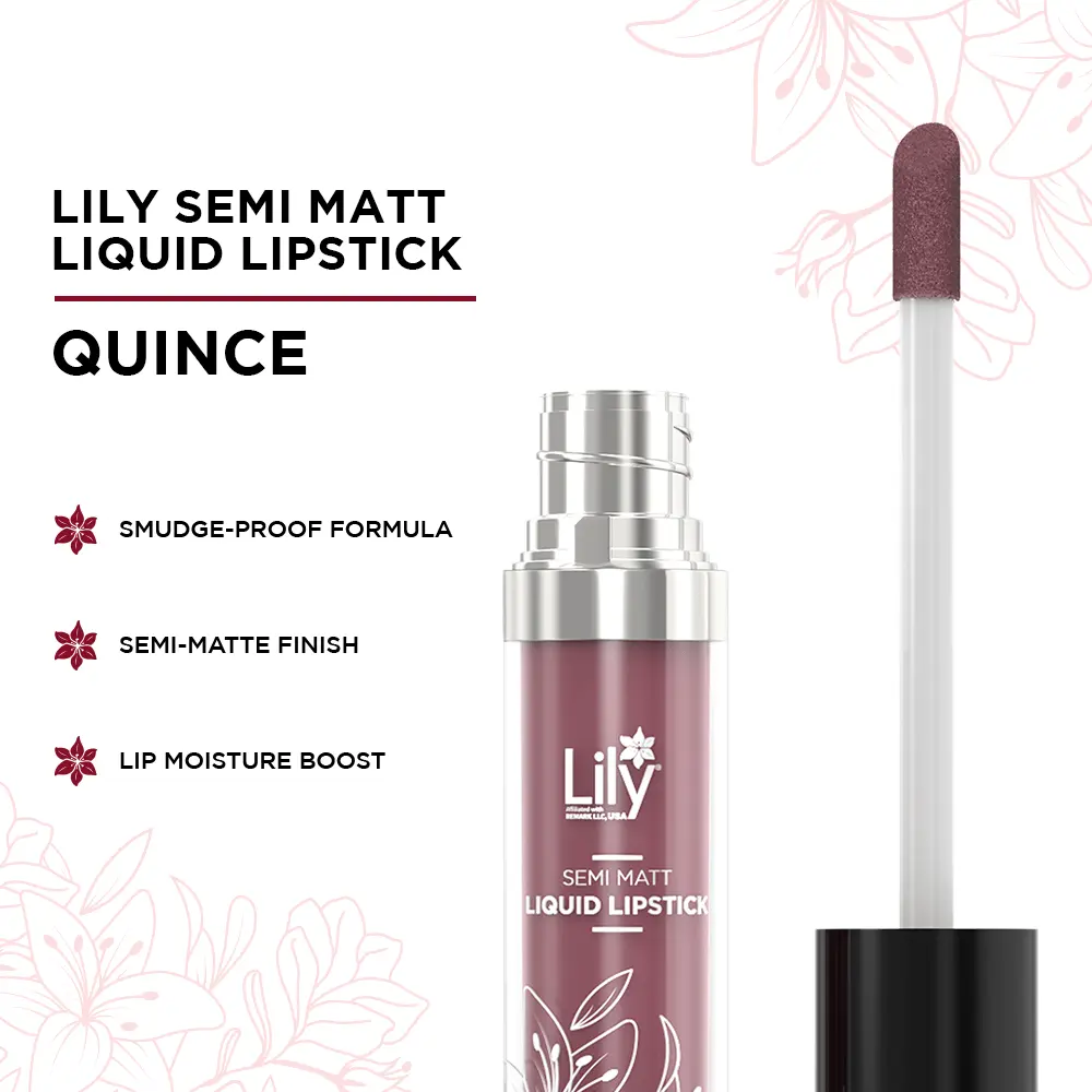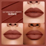Vitamin E: In addition to adorning your lips with distinctive shades, Lily Semi Matt Lipstick nurtures and hydrates your lips, ensuring they maintain their graceful charm. Jojoba Oil: Guarantees your lips remain velvety smooth and poised from sunrise to sunset. Rosa Canina Oil: Gently soothes and heals chapped lips. Other Ingredients : Isododecane, Disteardimonium Hectorite, Octyldodecanol, Nylon-12, Silica, Hydrogenated Styrene/Butadiene Copolymer, Polymethylsilsesquioxane, Hydrogenated Polyisobutene, Diethylhexyl Syringyliden, Tocopheryl Acetate, Rosa Canina Oil, Jojoba Oil, Olea Europaea Oil, Butyrospermum Parkii Oil and FragranceDescription