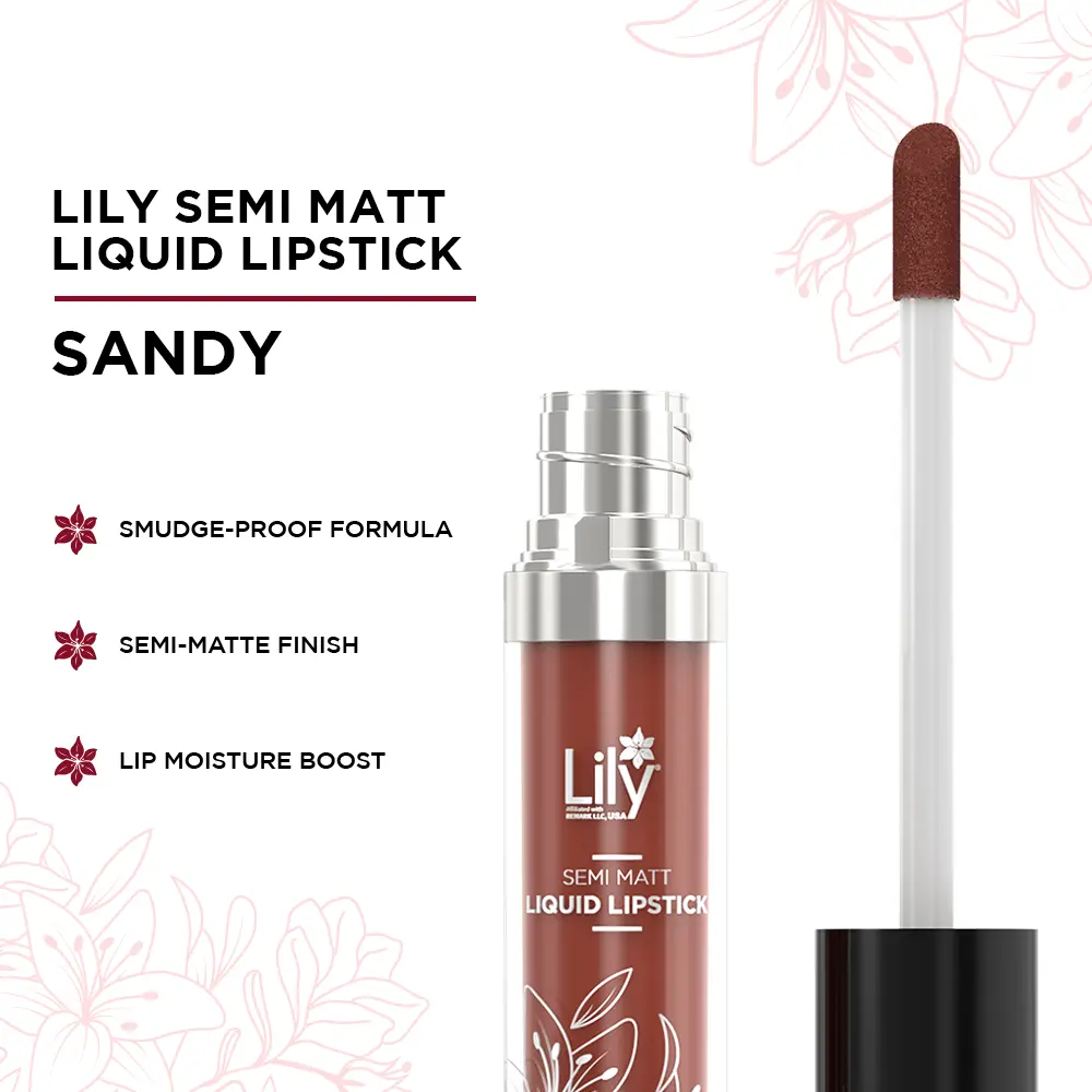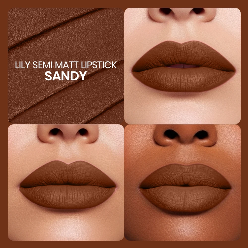 Vitamin E: In addition to adorning your lips with distinctive shades, Lily Semi Matt Lipstick nurtures and hydrates your lips, ensuring they maintain their graceful charm. Jojoba Oil: Guarantees your lips remain velvety smooth and poised from sunrise to sunset. Rosa Canina Oil: Gently soothes and heals chapped lips. Other Ingredients : Isododecane, Disteardimonium Hectorite, Octyldodecanol, Nylon-12, Silica, Hydrogenated Styrene/Butadiene Copolymer, Polymethylsilsesquioxane, Hydrogenated Polyisobutene, Diethylhexyl Syringyliden, Tocopheryl Acetate, Rosa Canina Oil, Jojoba Oil, Olea Europaea Oil, Butyrospermum Parkii Oil and FragranceDescription