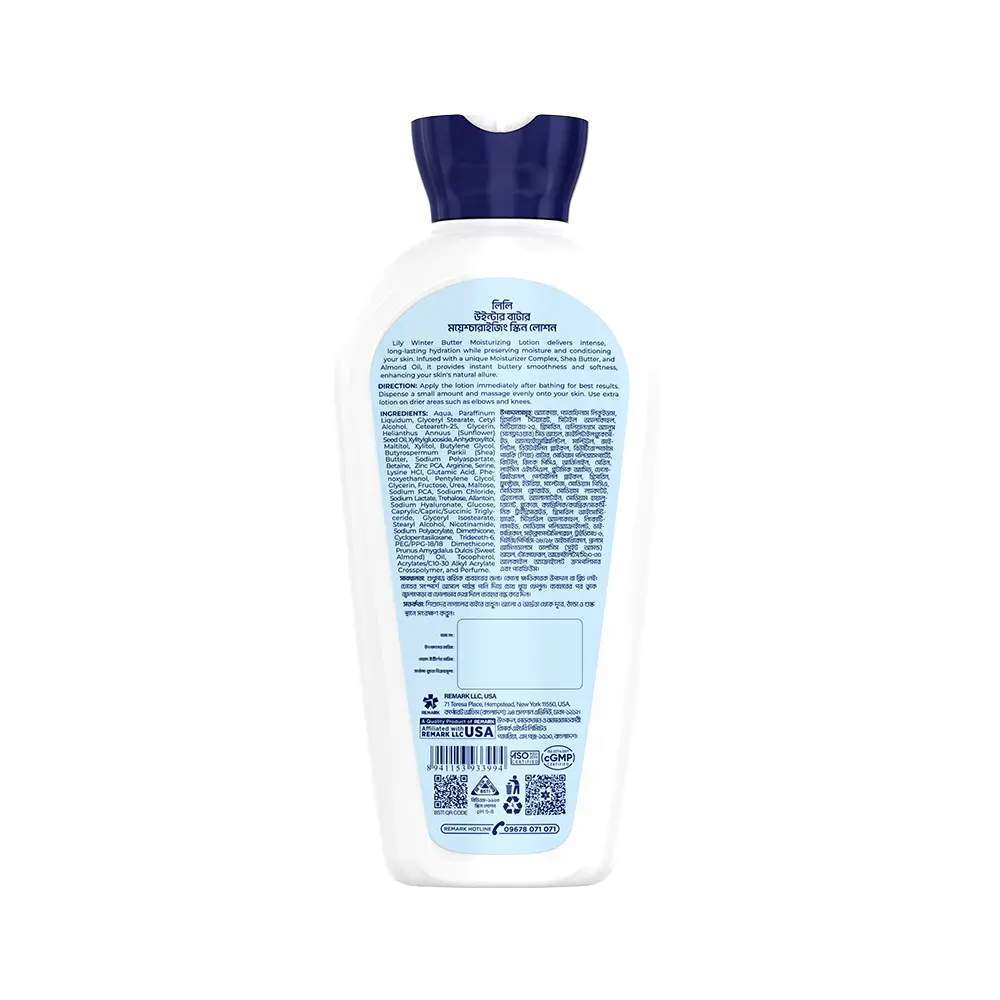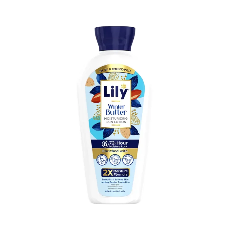 Lily Winter Butter Moisturizing Skin Lotion is designed to combat winter dryness with intense hydration and lasting protection. Powered by 2X Moisture Formula, Shea Butter, and Almond Oil, it deeply nourishes, smooths rough patches, and strengthens the skin’s barrier for silky-soft comfort that lasts up to 72 hours.