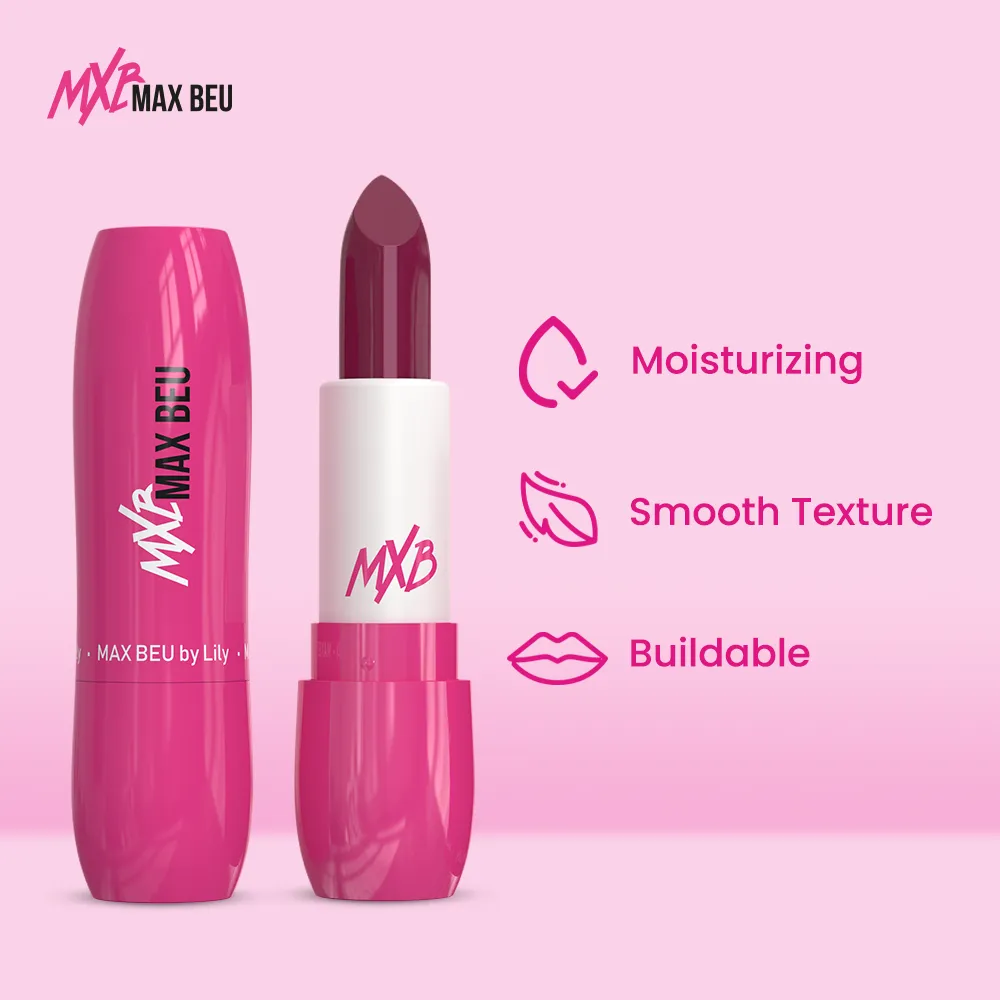 Max Beu Silk Finish Lipstick enhances your lips with vibrant color and smooth, comfortable wear, embodying luxury without compromise. This lipstick features a buildable formula enriched with Almond Oil to nourish and hydrate, delivering a silky texture that glides on effortlessly. Enjoy soft, moisturized lips with every application while maintaining vivid, long-lasting color.
