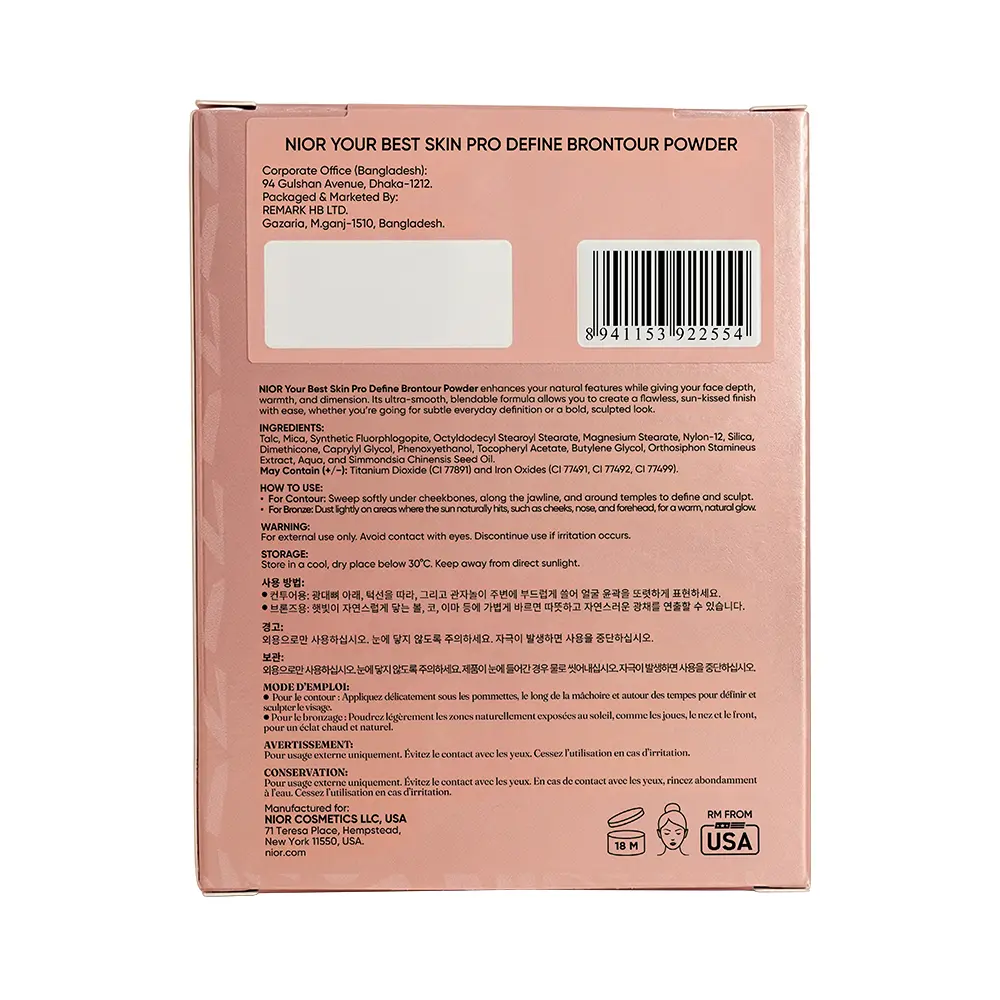 NIOR Your Best Skin Pro Define Brontour Powder enhances your natural features while giving your face depth, warmth, and dimension. Its ultra-smooth, blendable formula allows you to create a flawless, sun-kissed finish with ease, whether you’re going for subtle everyday definition or a bold, sculpted look.