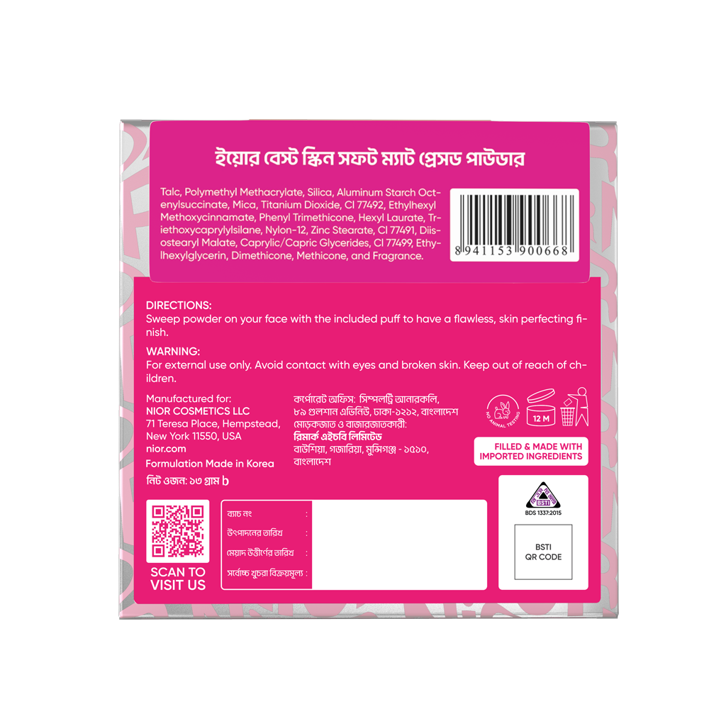 Before applying pressed powder, it’s crucial to find the ideal shade. Choose the shade from “”NIOR Your Best Skin Soft Matte Pressed Powder” that matches your skin tone perfectly. To identify your closest shade, apply a tester to your cheeks or jawline. Once you’ve found the ideal shade to match your skin tone, apply it all over your face with the given applicator.