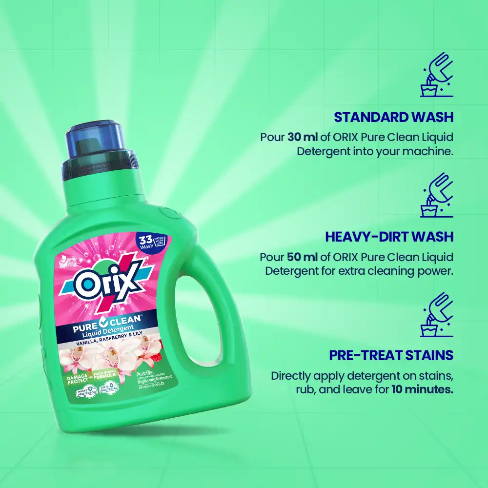 1. Use 30 ml of ORIX Pure Clean Liquid Detergent in the washing machine to wash your regular loads.