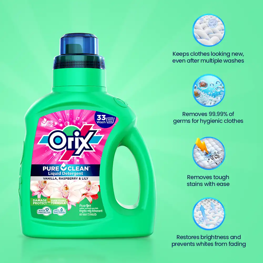 ORIX Pure Clean Liquid Detergent with Stain Guard Formula is specially formulated to keep your clothes safe from stains and smudges while taking care of the timeless appeal of your loved attire.