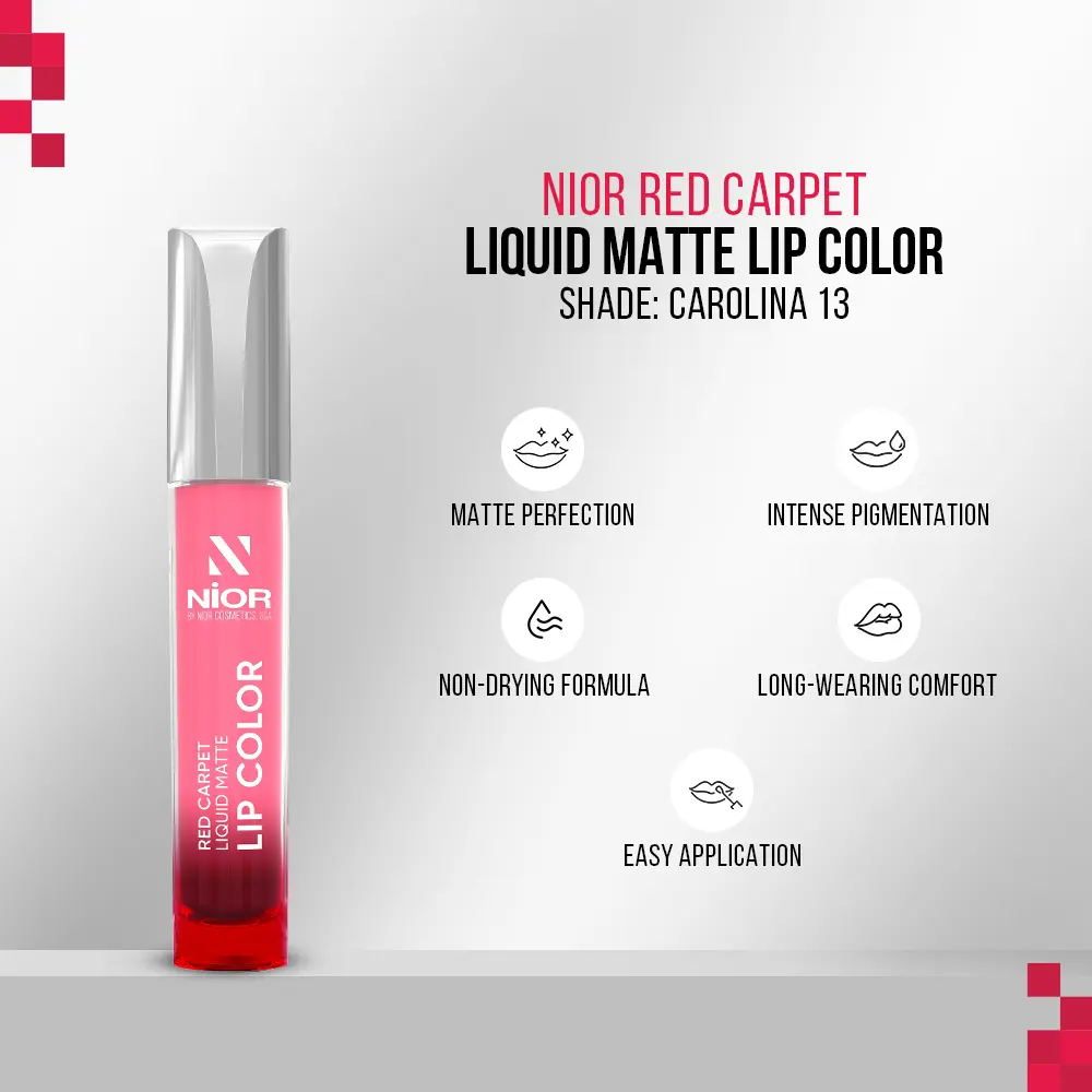 NIOR Red Carpet Liquid Matte Lip Color redefines your lip look with unparalleled style and durability. Featuring a sophisticated matte finish, this formula delivers intense, saturated color while nourishing your lips with shea butter and oils, ensuring a confident, long-lasting appearance from dawn till dusk.
