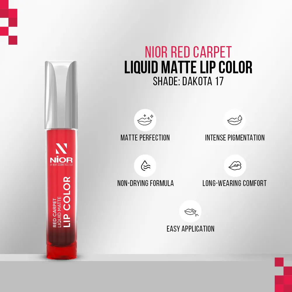 NIOR Red Carpet Liquid Matte Lip Color redefines your lip look with unparalleled style and durability. Featuring a sophisticated matte finish, this formula delivers intense, saturated color while nourishing your lips with shea butter and oils, ensuring a confident, long-lasting appearance from dawn till dusk.