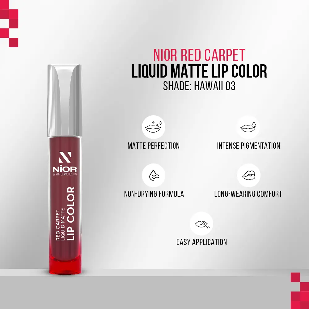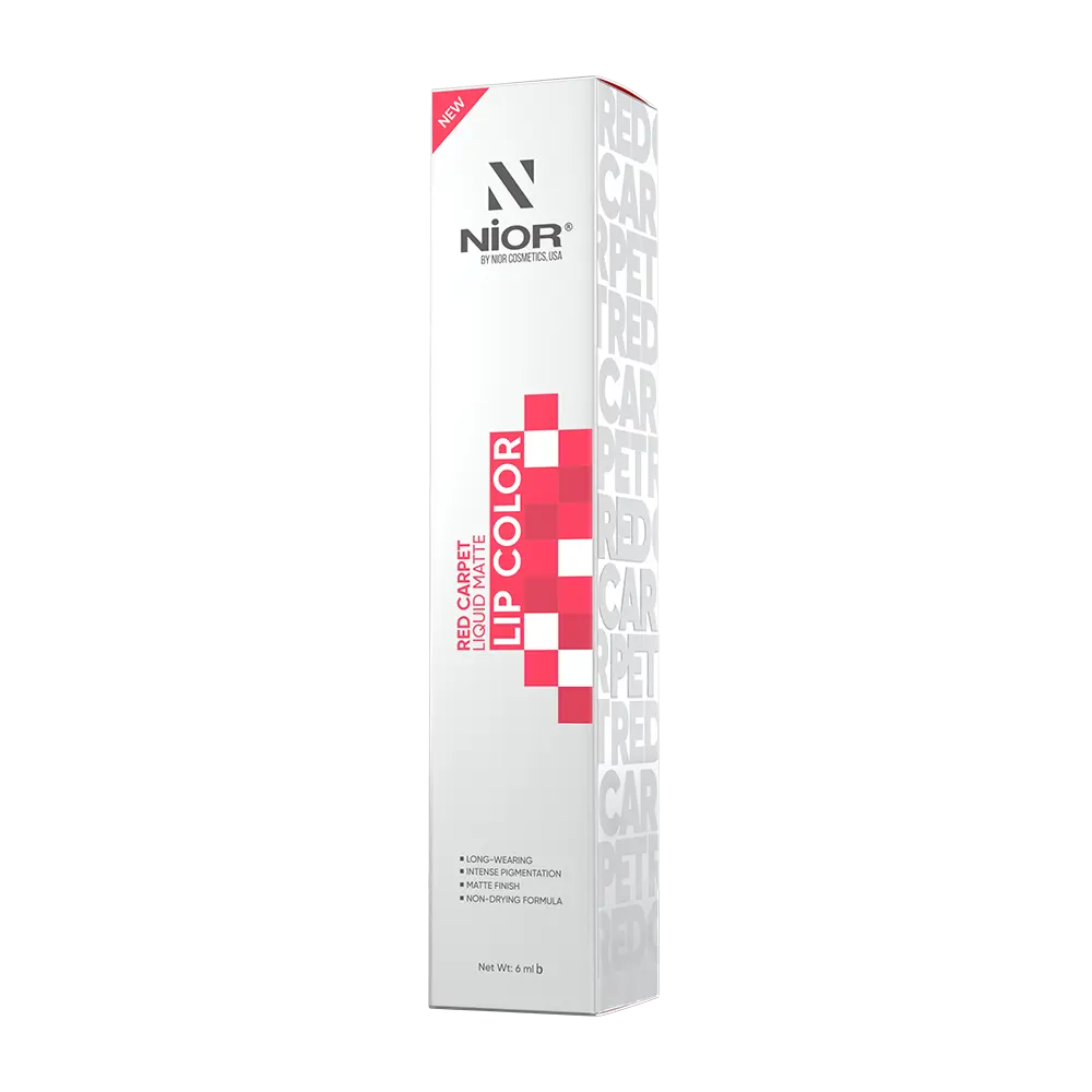 NIOR Red Carpet Liquid Matte Lip Color redefines your lip look with unparalleled style and durability. Featuring a sophisticated matte finish, this formula delivers intense, saturated color while nourishing your lips with shea butter and oils, ensuring a confident, long-lasting appearance from dawn till dusk.