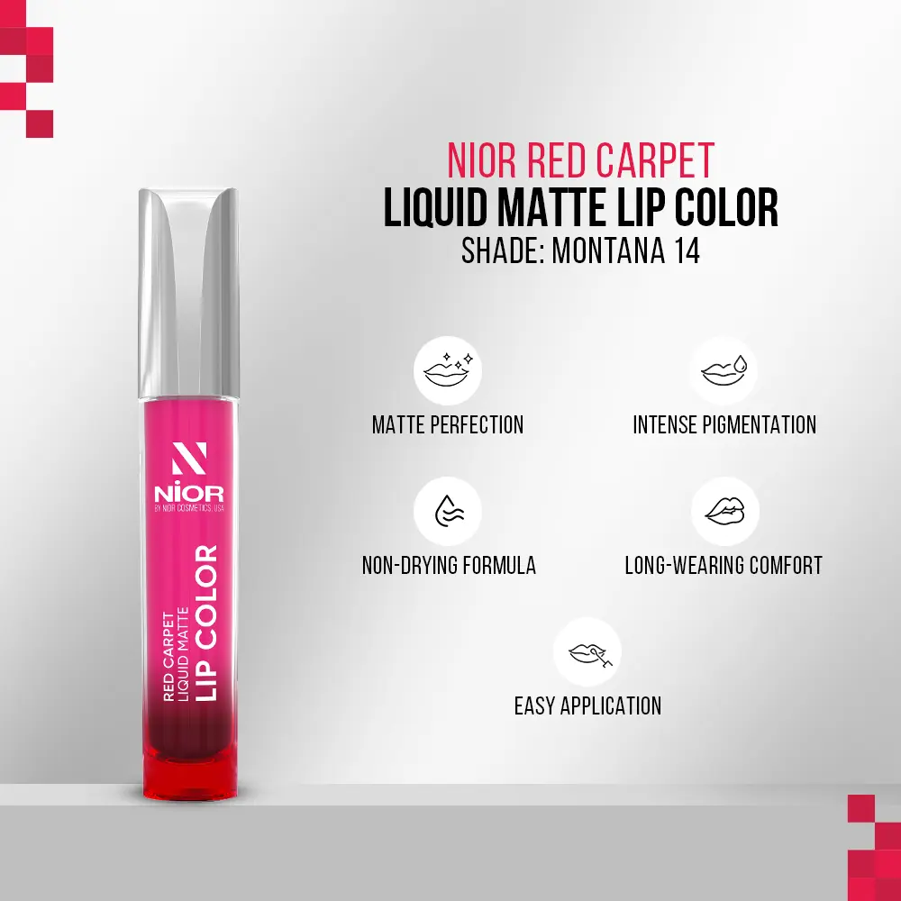 NIOR Red Carpet Liquid Matte Lip Color redefines your lip look with unparalleled style and durability. Featuring a sophisticated matte finish, this formula delivers intense, saturated color while nourishing your lips with shea butter and oils, ensuring a confident, long-lasting appearance from dawn till dusk.