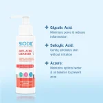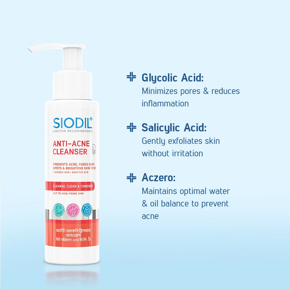 | Siodil Anti-Acne Cleanser is an efficient cleanser formulated with active ingredients such as Glycolic Acid & Arginine, Salicylic Acid & Acacia Senegal Gum and Aczero. Its Advanced Formulation exfoliates dead skin cells and removes impurities and dirt from the surface of the face. |