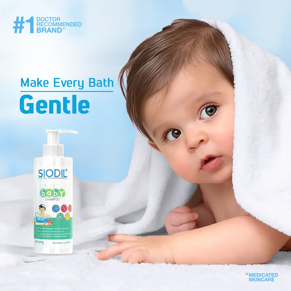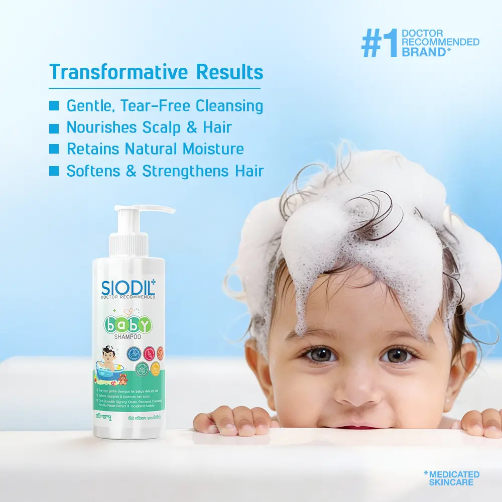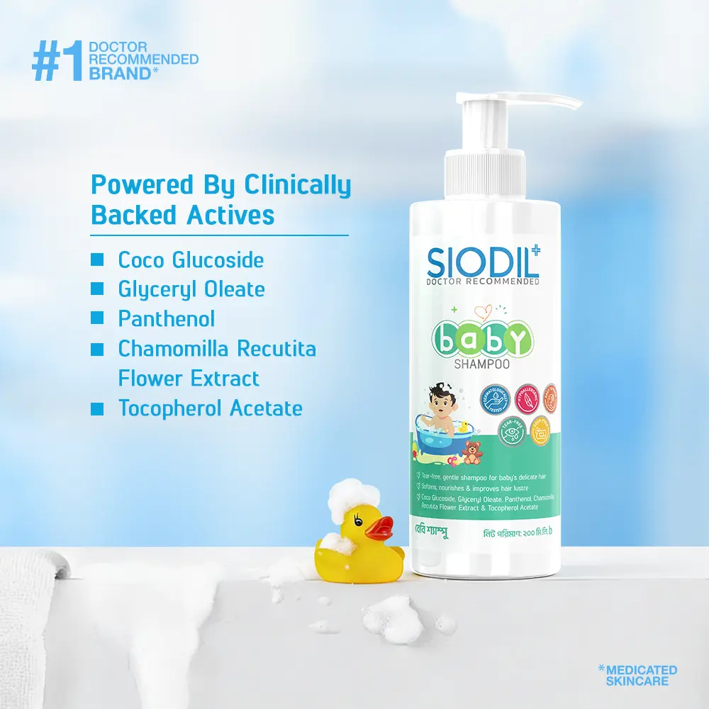 SIODIL Baby Shampoo is a tear-free, gentle shampoo that is formulated especially for delicate baby hair. It contains Chamomilla Recutita Flower Extract , Coco Glucoside, Glyceryl Oleate, Panthenol, and Tocopherol Acetate which gently cleanse and nourish your baby’s scalp and hair, leaving it feeling soft and shiny.
