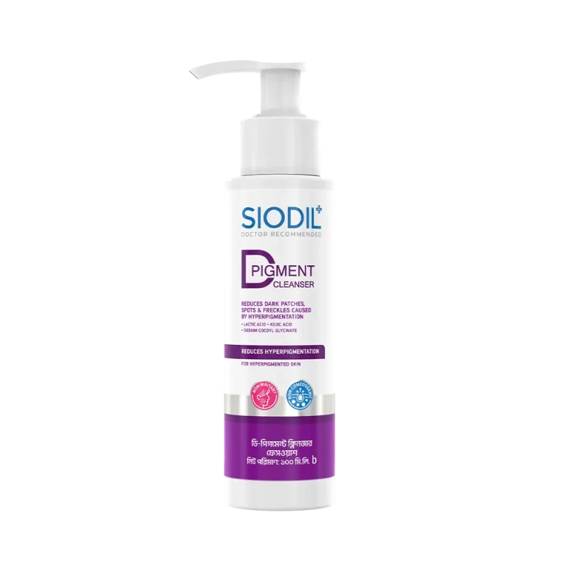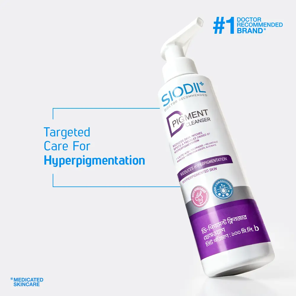 Siodil D-Pigment Cleanser is formulated with active ingredients like Lactic Acid, Kojic Acid, and Sodium Cocoyl Glycinate that help cleanse and treat hyperpigmentation (sunspots, melasma, and age spots) while improving skin tone and texture.
