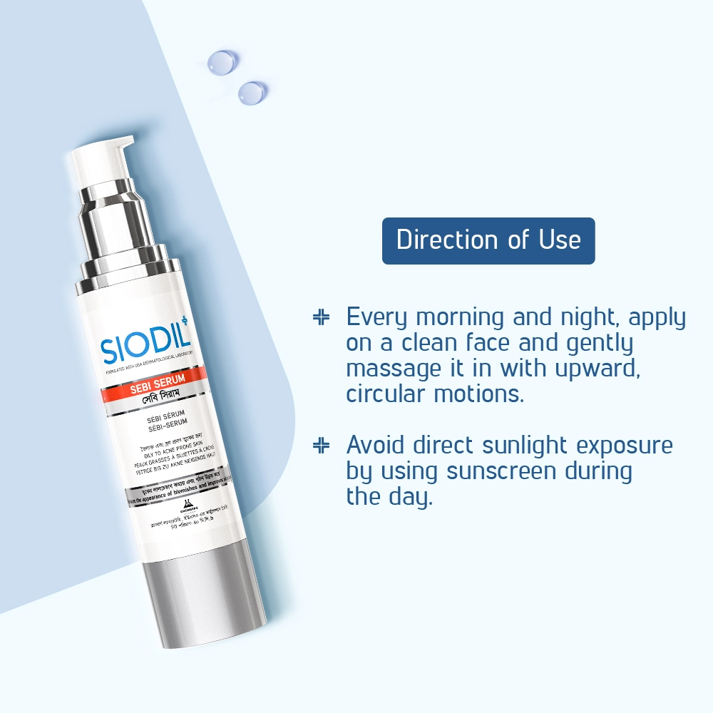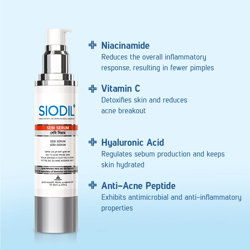 Siodil Sebi Serum is formulated with a high concentration of active ingredients, such as Niacinamide, Vitamin C, Hyaluronic Acid, and Anti-acne Peptide that helps reduce acne breakouts and makes the skin more smooth and hydrated.