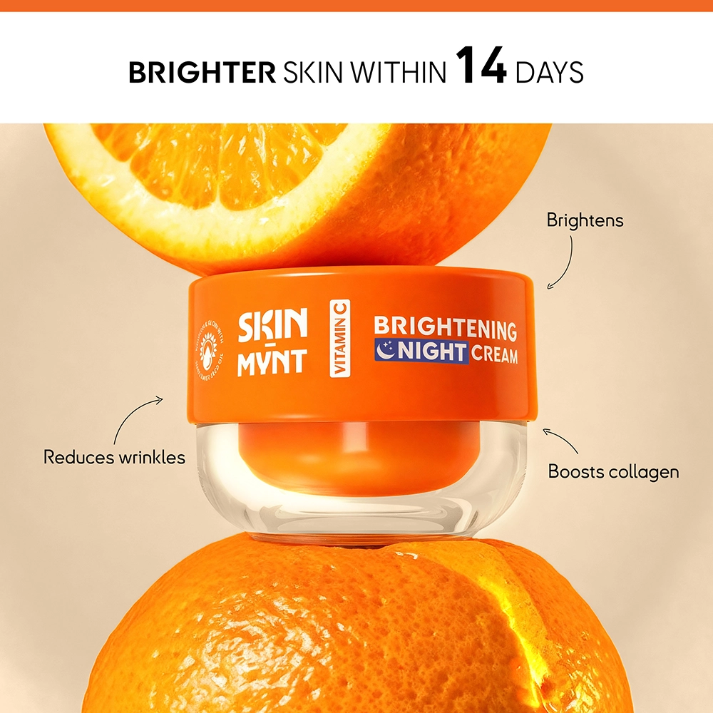 Wake up to radiant skin with Skin Mynt Vitamin C Brightening Night Cream. This non-greasy formula, enriched with a Synergistic Vitamin C Booster and Citrus Junos (Yuzu) Fruit Extract, nourishes your skin overnight, leaving it glowing and revitalized. See a noticeable brightness in just days.