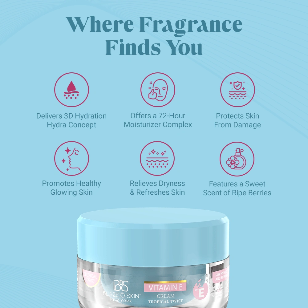Revel in the bliss and true essence of skincare with Blaze O’ Skin Tropical Twist Vitamin E Skin Cream. Enriched with the nourishing properties of Hyaluronic Acid, Allantoin, and Glycerin, this sublime formula is designed to provide long-lasting hydration, giving your skin the love it deserves. From dehydrated, parched skin to irritated, damaged skin, this cream is here to replenish your skin with the moisture it craves.  Blaze O’ Skin Tropical Twist Vit E Skin Cream captures the enchanting aroma of a tropical spark that dances upon the senses.